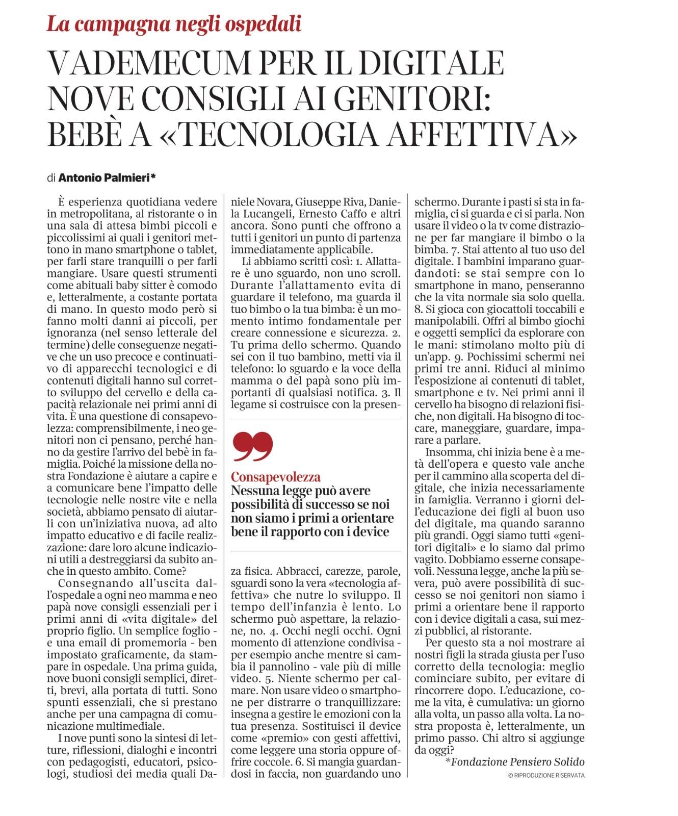 Un interessante articolo di Antonio Palmieri di Fondazione Pensiero Solido pubblicato il 4 novembre sul Corriere della Sera: un vademecum per genitori con nove consigli pratici per favorire una “tecnologia affettiva” nei primi anni di vita dei bambini.