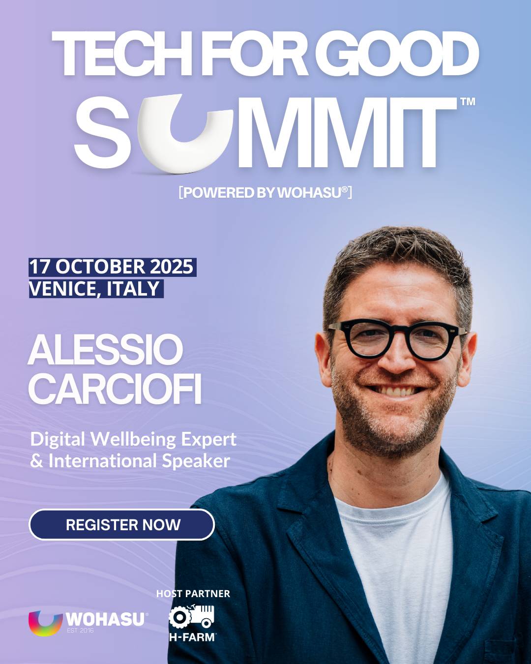 Con grande emozione condivido che salirò sul palco del Tech for Good Summit, powered by WOHASU® e ospitato da H-FARM: un evento internazionale che riunisce voci da business, scienza, educazione e policy da tutto il mondo. Negli anni ha portato sul palco, tra gli altri, Arthur Brooks, Laurie Santos, Martin Seligman, Mo Gawdat, Vivek Murthy e tantissimi altri. Quest’anno (ci sarò anche io) salirò sul palco per condividere dieci anni di lavoro su tecnologia & umanità.